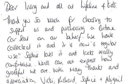 Her delighted Mum writes to us, Dear all at Lifeline 4 Kids...Thank you so much for choosing to support us and purchasing the car seat, which is now in regular use. Sophie loves it and it looks really comfortable. Words cannot express how grateful we are. With many thanks and appreciation. "
