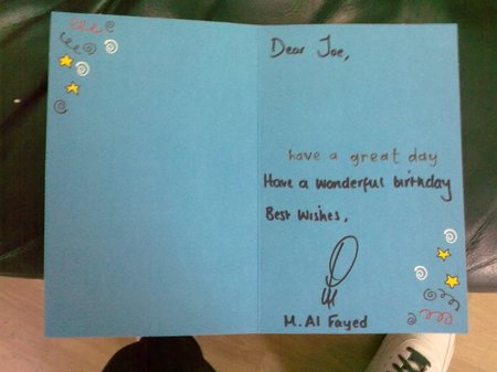 Many thanks to Mr Al-Fayed for his generosity and for helping to make Joe's birthday a very happy one indeed and one that he will never forget!
