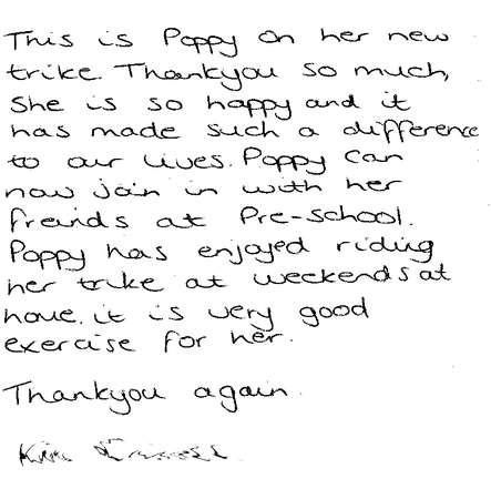 Little Poppy C who lives in Devon has spastic quadriplegic cerebral palsy and can't sit or walk unaided. Her Mum asked us for a specially adapted Trike for her to be used at home and especially at pre-school so that she could join in with group classes when all of the other children were using their bikes. Lifeline 4 Kids were delighted to buy her the special Trike. She no longer has to just sit in her chair and watch the others at play but is now enjoying the freedom. Good luck Poppy!